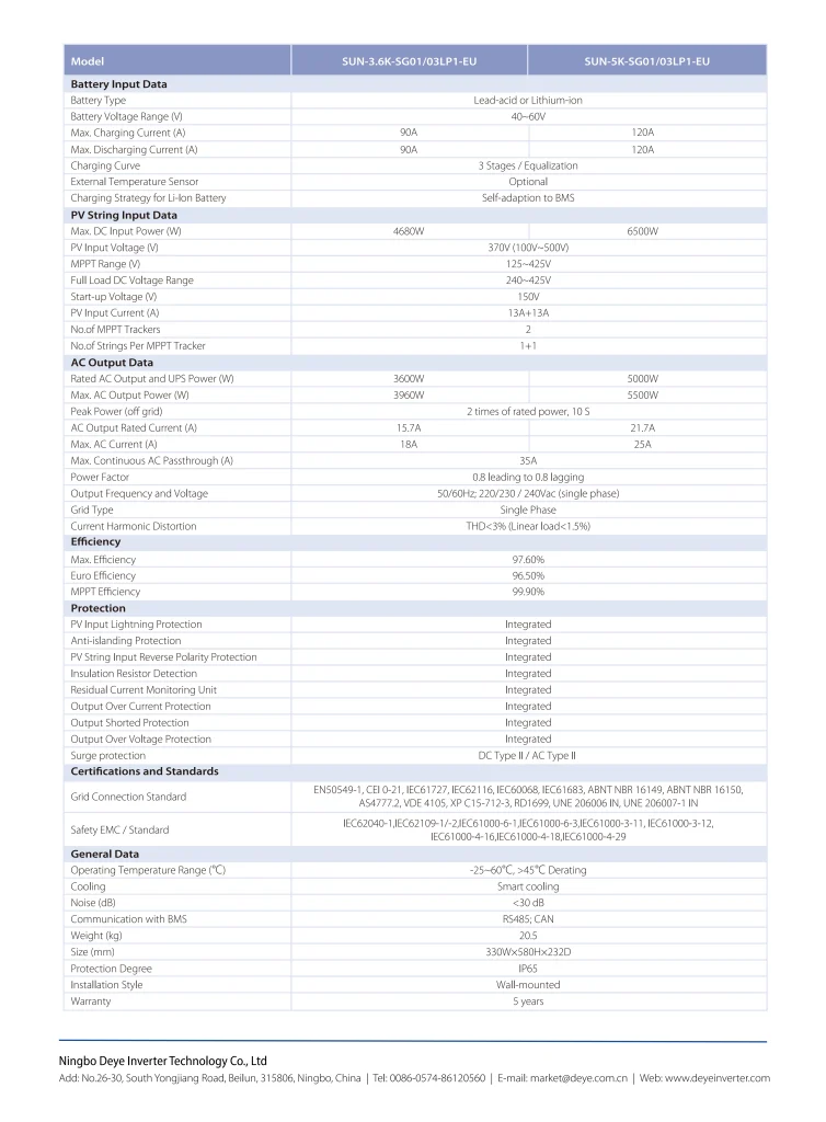 Deye SUN-3.6/5K-SG01/03LP1-EU EU Version 3.6K-5KW Low voltage single phase hybrid inverter