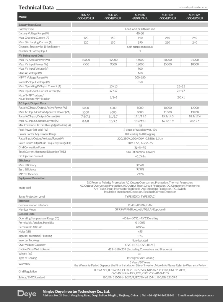 The Deye Three Phase Hybrid Inverter, encompassing models SUN-5K-SG04LP3-EU, SUN-6K-SG04LP3-EU, SUN-8K-SG04LP3-EU, SUN-10K-SG04LP3-EU, and SUN-12K-SG04LP3-EU, is a sophisticated energy management solution designed for both residential and commercial solar power applications. This series of inverters is engineered to integrate solar power generation with battery storage, ensuring optimal energy utilization and enhancing overall system efficiency.