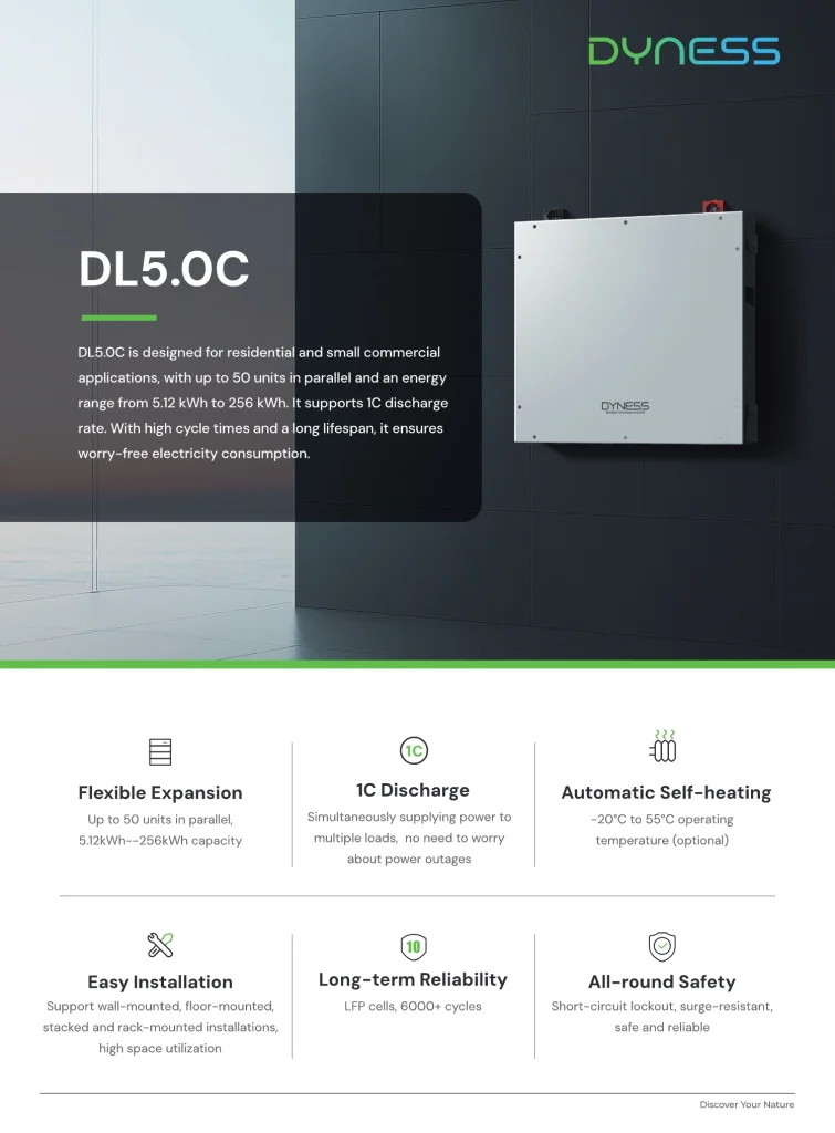 DL5.0C is designed for residential and small commercial applications, with up to 50 units in parallel and an energy range from 5.12 kWh to 256 kWh. It supports 1C discharge rate. With high cycle times and a long lifespan, it ensures worry-free electricity consumption.