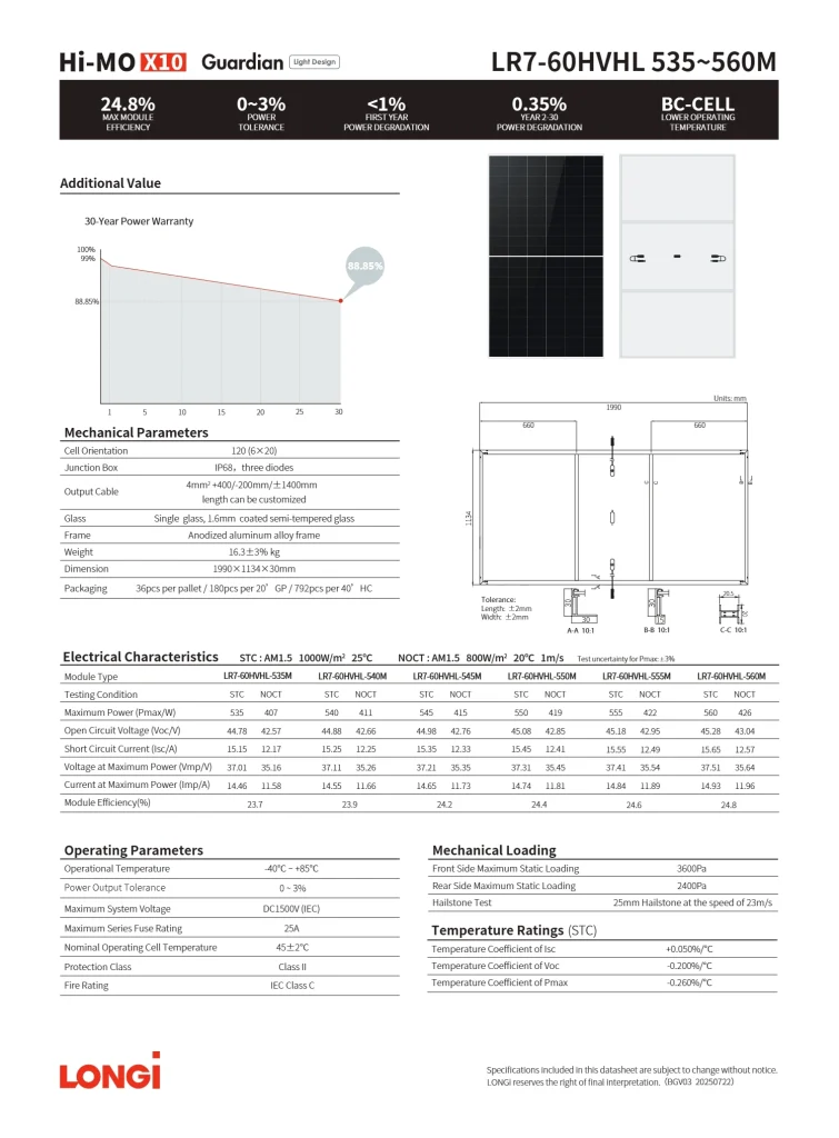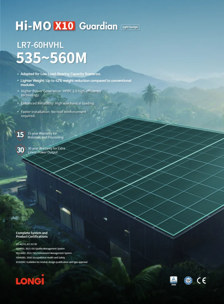 Longi Hi-MO X10 Guardian LR7-60HVHL 535~560M Single glass solar panels