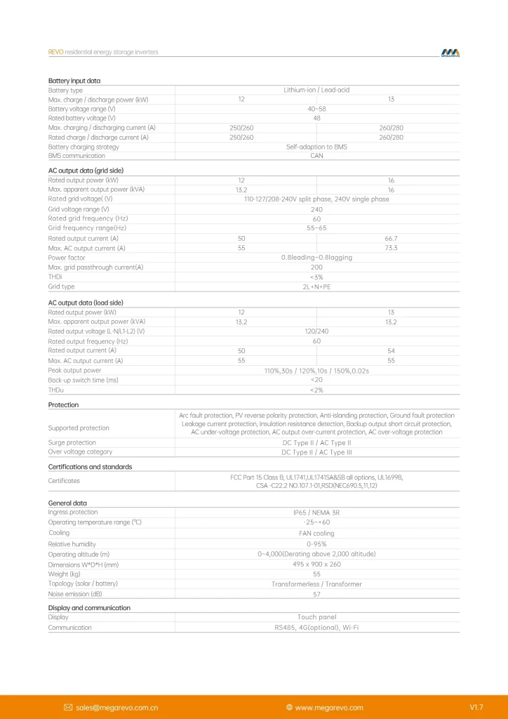 Megarevo’s split phase hybrid inverter has passed UL 1741:2021, IEEE 1547.1, UL 1699B, and South Africa’s NRS097-2-1:2017, demonstrating compliance with key grid-interconnection and safety standards.