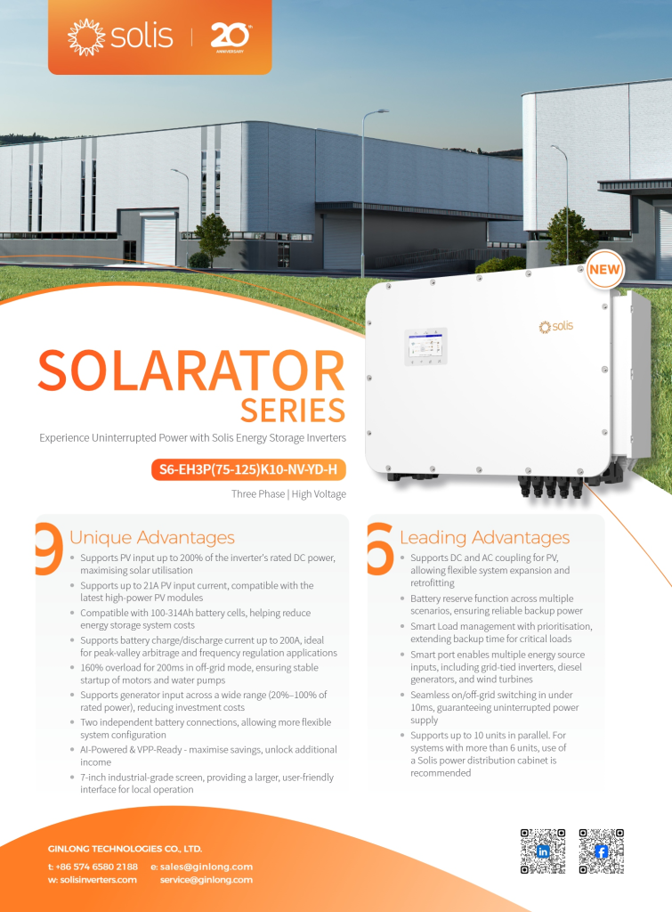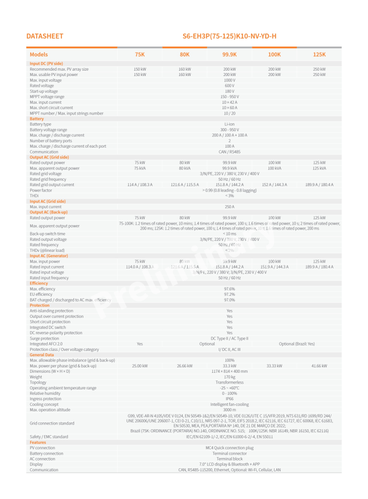 Introducing the S6-EH3P(75-125)K10-NV-YD-H Series, High-voltage. three-phase energy storage for commercial applications. This advanced inverter series boasts a maximum charge/discharge current of 100A + 100A across two independently controlled battery ports. It features 10 integrated MPPTs, each supporting a string current of up to 21A – ensuring exceptional power delivery. Designed for both on-grid and off-grid applications, the S6-EH3P(75-125)K10-NV-YD-H series supports parallel operation of up to six units. Its dedicated backup port can handle overloads of up to 2.0 times rated power for short durations. Thanks to its wide voltage range, the series is compatible with a broad selection of battery types and supports peak shaving control in both “self-use” and “generator” modes.