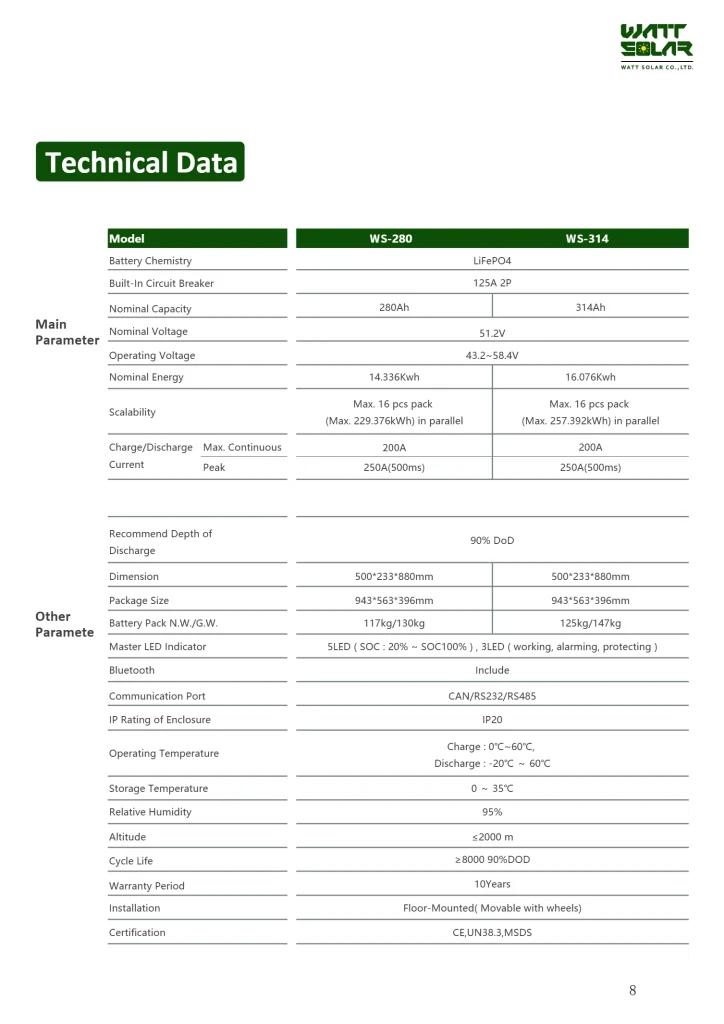 Wattsolar WS-280/314 51.2V Low-voltage Lithium battery